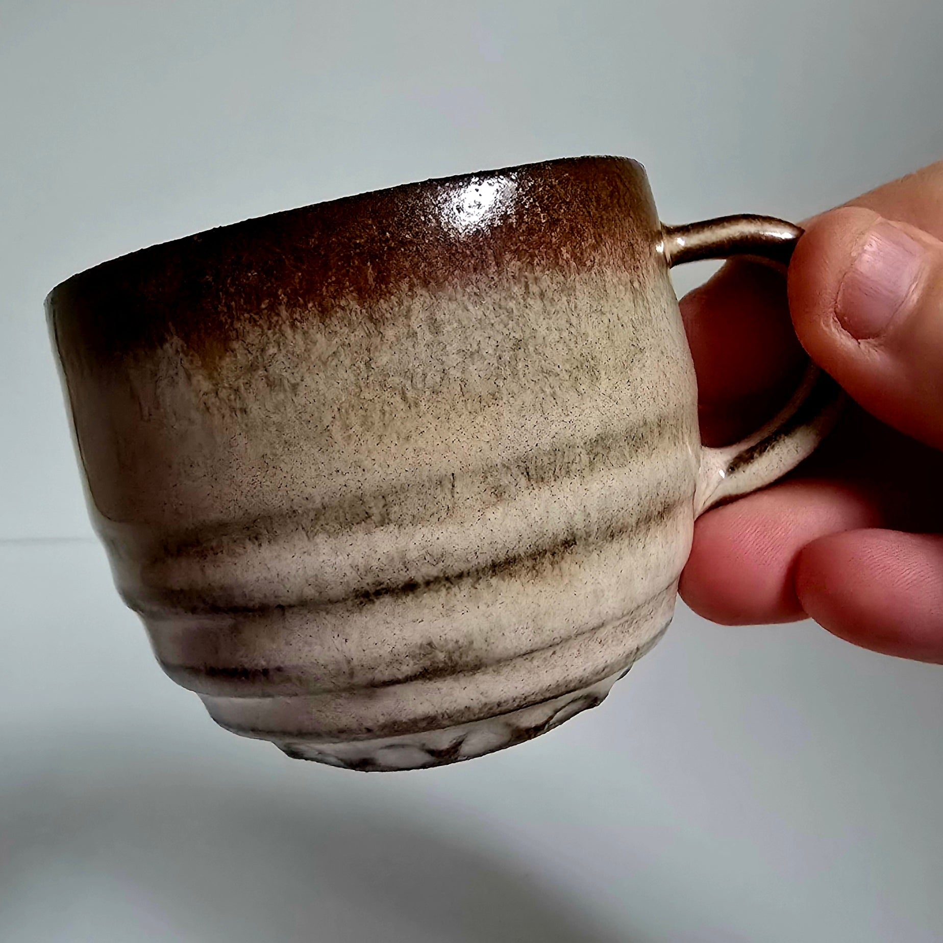 Enjoy your espresso in a cup that feels as special as the ritual itself. Each espresso cup is wheel-thrown and hand-finished, featuring rich glazes that flow from earthy browns to deep green tones. One version carries a smooth, subtle surface, while the other showcases a bold, carved texture that adds both grip and visual depth.